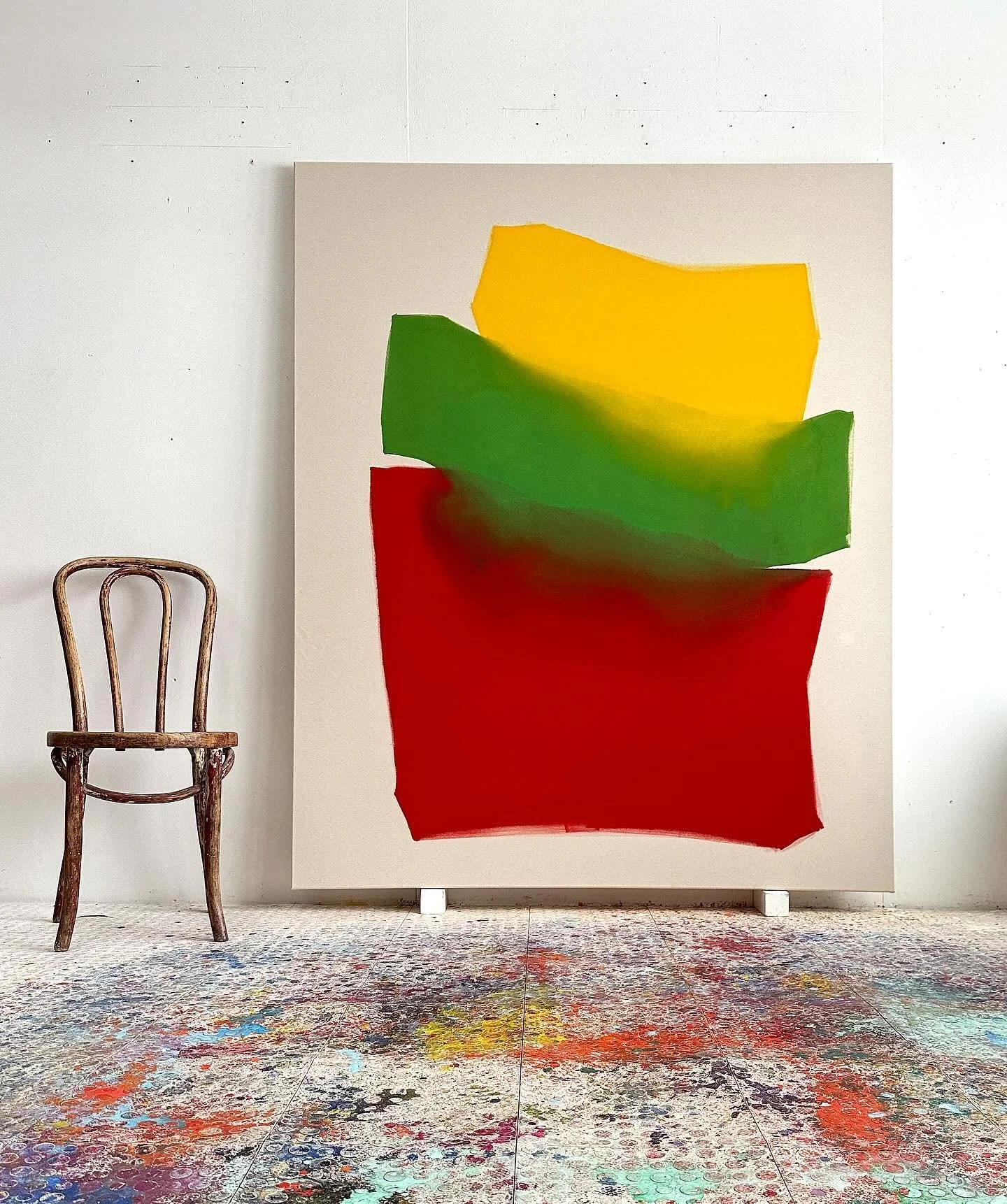 His work features a bold use of color and abstract forms. Each piece is marked by large, clear blocks of color, with intense hues bleeding into each other yet maintaining a distinct separation through blurred edges. The color palette, though varied, consists of deeply saturated tones that command attention.